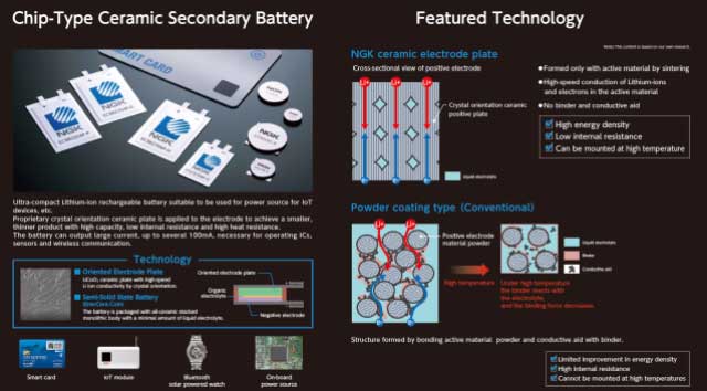 EnerCera有兩種類型:“ EnerCera Coin”,一種厚度為1毫米至2毫米的硬幣型電池,用于安裝在電路板上;“ EnerCera Pouch”,一種超薄且可彎曲的電池,厚度為0.4毫米至0.45毫米,用于嵌入卡。EnerCera硬幣是通過向其帶有電極和隔板的全陶瓷堆疊式整體中添加少量液體電解質(zhì)制成的。NGK將這些獨(dú)特的電池定義為“半固態(tài)電池”。他們?nèi)〉昧耸澜缟系谝粋€(gè)工作溫度為85°C的鋰離子二次電池,使用壽命長達(dá)10年,這是對(duì)物聯(lián)網(wǎng)設(shè)備的兩個(gè)很大要求。