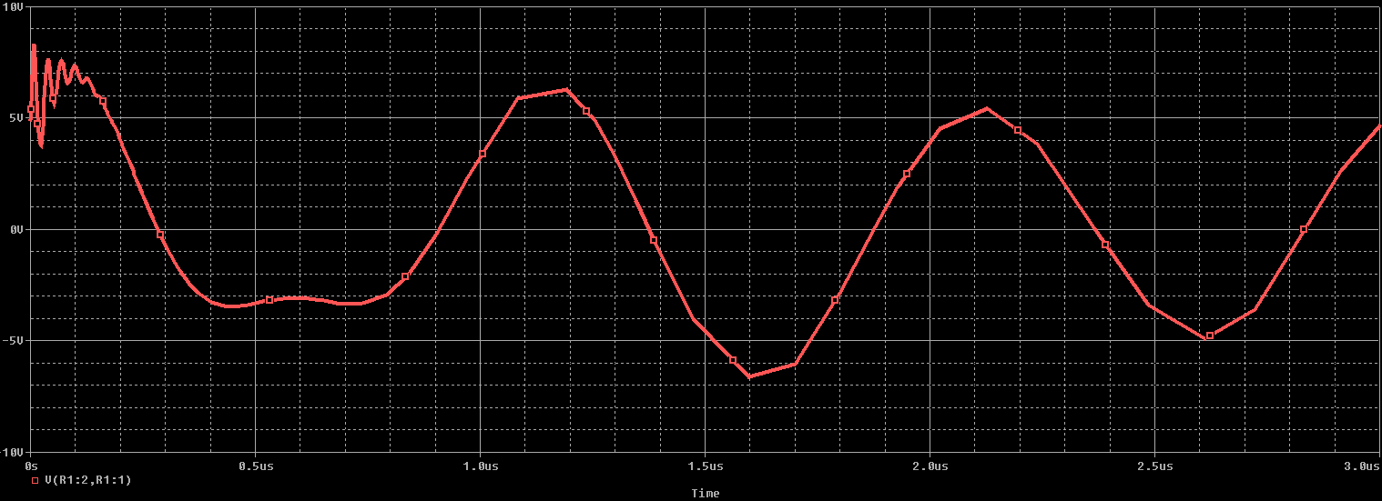 運行于1 MHz的模擬電路的瞬態(tài)分析結果。來自1.2 MHz FM EMI信號的調制似乎疊加在所需的1 MHz信號之上