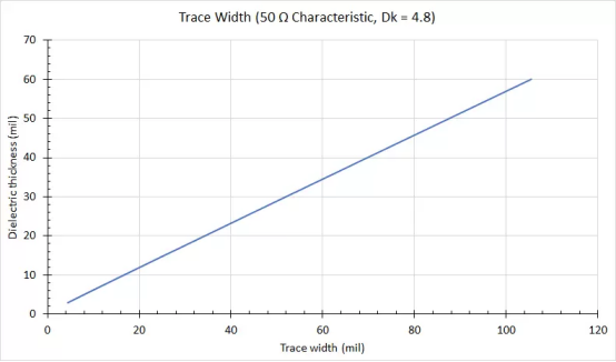 2. Dk = 4.8襯底上特性阻抗為50歐姆時的電介質(zhì)厚度與走線寬度的關(guān)系。