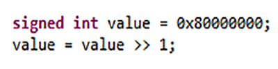 作為實(shí)現(xiàn)定義的行為的示例,請(qǐng)考慮當(dāng)有符號(hào)整數(shù)右移時(shí)的高階位的傳播。結(jié)果是0x40000000還是0xC0000000